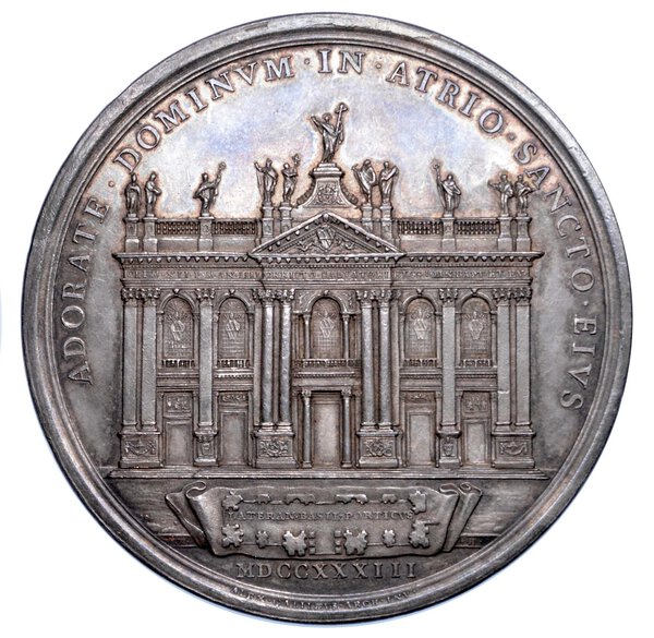 CLEMENS XII PONT MAX AN III Busto del Papa benedicente a d., con tiara e piviale. R/ ADORATE DOMINVM IN ATRIO SANCTO EIVS Veduta frontale di S. Giovanni in Laterano sul timpano, stemma Corsini sull'architrave, iscrizione CLEM XII P M AN III CHRISTO SALVATORI ET SS IOAN BAPT ET EV sotto, pianta del nuovo portico e iscrizione LATERAN BASIL PORTICVS in esergo, MDCCXXXIII sotto, sul bordo, ALEX GALILAEVS ARCH INV. Opus Ottone Hamerani. Patrignani 19. Rarissima. g. 163,61. Diam. mm. 71,87. Arg. SPL