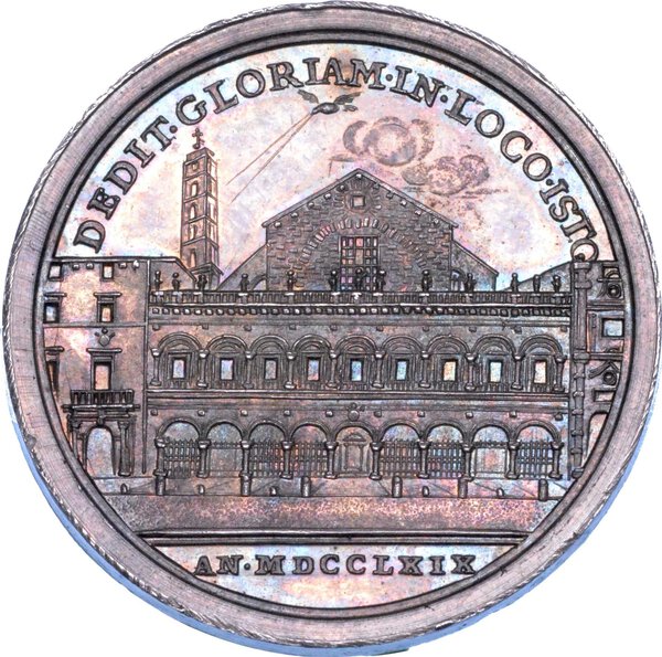 CLEMENS XIV PONT M A I Busto a d. con camauro, mozzetta e stola. R/ DEDIT GLORIAM IN LOCO ISTO Prospetto della Basilica dei SS. Dodici Apostoli in esergo, AN MDCCLXIX. Opus Ferdinando Hamerani. Bart. E769. Modesti 247. Molto rara. g. 11,65. Diam. mm. 31,33. Arg. Patina di medagliere. SPL/FDC