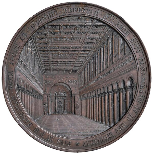 Pio IX (1846-1878) Medaglia coniata di grande modulo 1854 Restauri alla Basilica di San Paolo fuori le mura, vista prospettica dell'interno della Basilica - Opus: G. Bianchi - R.Z 731; Bartolotti MM, 7 (D/5; R/6); Bartolotti Pio IX, IX - 25a - Rara - AE (g.272 - Ø 82 mm) Colpetti al bordo SPL-qFDC