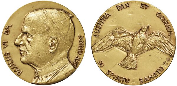 Paolo VI (1963-1978) Medaglia A. XIII - Opus: Greco AU (g 62,94 - tit. 750 - Ø 44 mm) In astuccio e con bustina in pergamino con le chiavi pontificie FDC