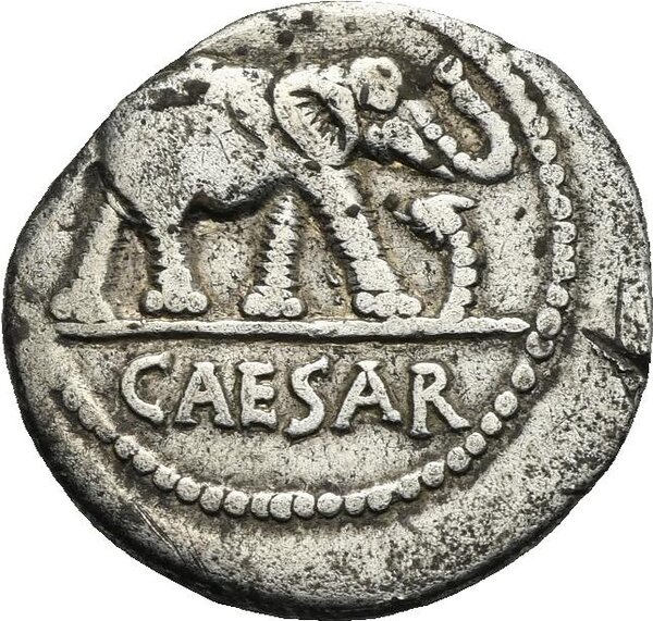 Roman Republic. C. Julius Caesar. Denarius (Silver, 18.59 mm, 3.62 g). Military mint moving with Caesar. 49-48 BC. CAESAR, Elephant walking right, trampling on horned serpent. Rev. Priestly implements: culullus, aspergillum, axe with wolf's head at the top, and apex. Crawford 443/1. Sydenham 1006. Babelon (Julia) 9. BMCRR Gaul 27. Lightly toned. Banker's mark on reverse. Very Fine.