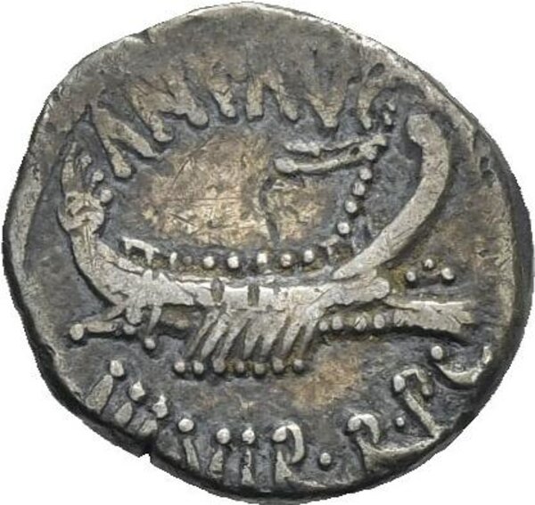Roman Republic. Mark Antony. Denarius - Legionary Type (Silver, 17.43 mm, 3.59 g). Military mint moving with Antonius (Patrae ?). Circa 32-31 BC. ANT AVG / III VIR R P C, Praetorian galley right, with scepter tied with fillet on prow. Rev. LEG VIII, Legionary eagle right between two standards. Crawford 544/21. Sydenham 1225. Babelon (Antonia) 114. BMCRR East 199. Cohen I, 35. RBW Coll. 1843. Old cabinet tone. Slightly off center on reverse. Good Very Fine.