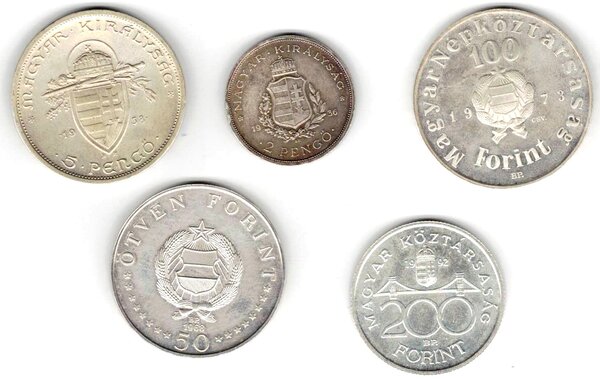 Ungheria. Lotto di 5 Monete in Ag. 5 Pengo 1938, 2 Pengo 1936, 200 Fiorini 1992, 100 Fiorini 1973, 50 Fiorini 1968. Dall'MB al FDC. MB-FDC
