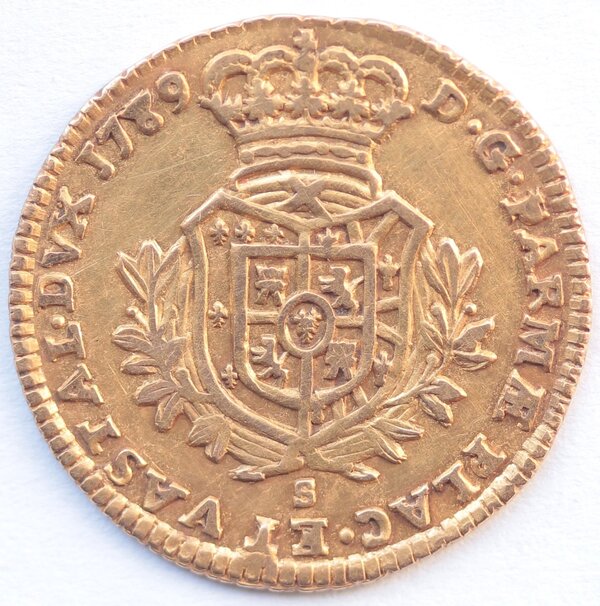 Parma. Ferdinando I. 1765-1802. Mezza Doppia 1789. Au. MIR 1066/4. Peso gr. 3,53. qSPL. RR. qSPL