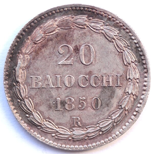 Roma. Pio IX. 1846-1870. 20 Baiocchi 1850 ANN IV. Ag. Gig. 81. Peso gr. 5,39. Diametro mm. 23. qFDC. Patina iridescente. qFDC