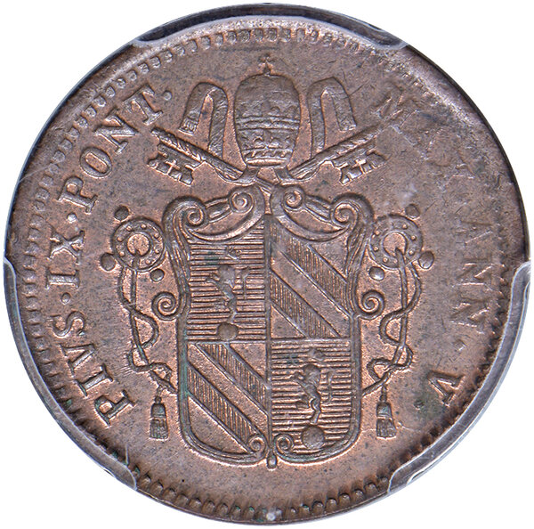 Roma, Pio IX (1846 - 1870) - 1/2 Baiocco, 1851-V, Cu, gr. 5, C, GIG 250, in SLAB PCGS MS63 #17286902. qFDC/FDC