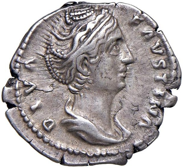 Faustina I (moglie di Antonino Pio) Denario - Busto drappeggiato a d. - R/ AETER-NITAS, trono drappeggiato di fronte, con scettro trasversale inclinato a destra davanti, pavone in piedi a destra in primo piano - RIC 353 AG (g 3,30) BB