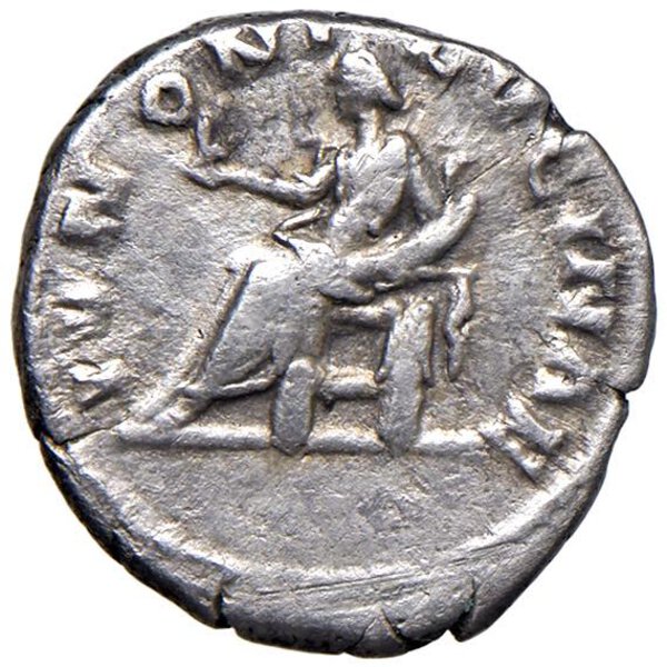Lucilla (moglie di Lucio Vero) Denario - Busto drappeggiato a d. - R/ Giunone seduta a s., con un fiore nella mano destra e un bambino in fasce nella sinistra - RIC 275 AG (g 3,15) qBB