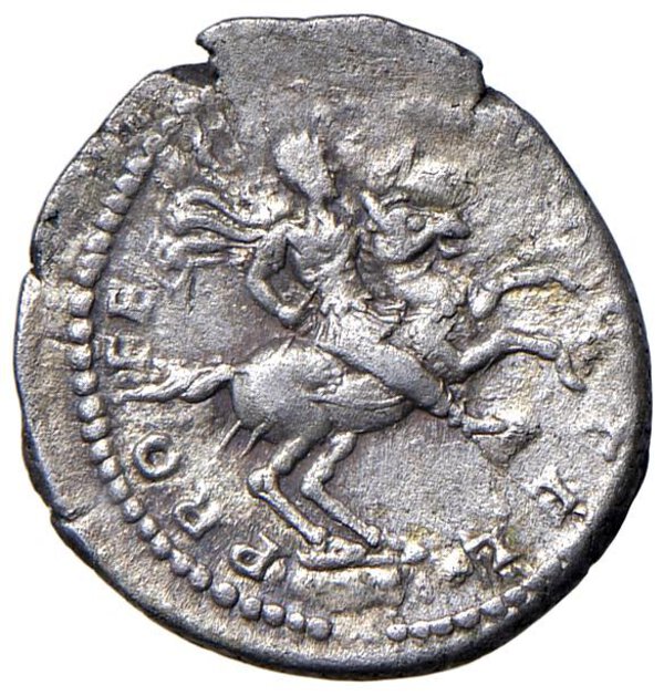 Settimio Severo (193-211) Denario - Testa laureata a d. - R/ L'Imperatore su un cavallo impennato verso destra, con una lancia trasversale nella mano destra - RIC 138 AG (g 3,23) qBB