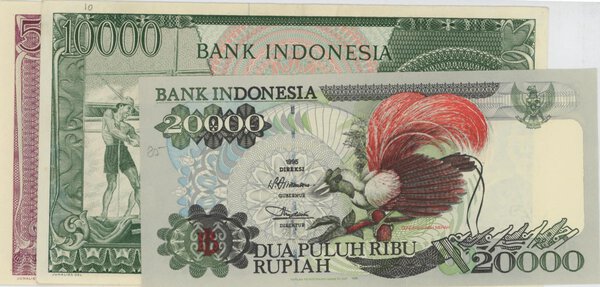 INDONESIA lotto di 3 banconote: 20000 Rupiah 1995 pick#135a + 10000 Rupiah 1964 pick#100 + 5000 Rupiah 1958 pick#64 numeri a matita qSPL-FDS