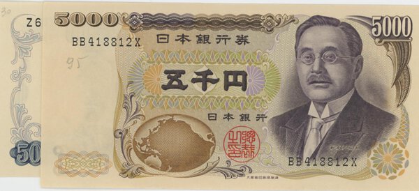 JAPAN lotto di 2 biglietti: 500 Yen 1969 pick#95a + 5000 Yen 1993-2003 pick#101 numeri a matita SPL-FDS