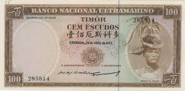 TIMOR 100 Escudos 1963 pick#28a numero a matita q.fds