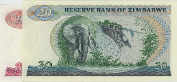 ZIMBABWE lotto di 2 banconote: 10$ 1980 pick#3a + 20$ 1983 pick#4c numeri a matita qFDS