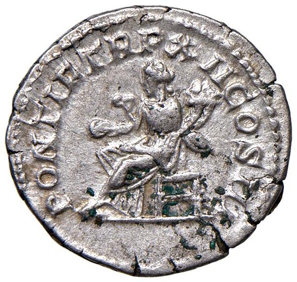 Caracalla (211-217) Denario - Testa laureata a d. - R/ Concordia seduta a s., con patera e due cornucopie - RIC 111 AG (g 3,79) Frattura di tondello. Macchie verdi BB