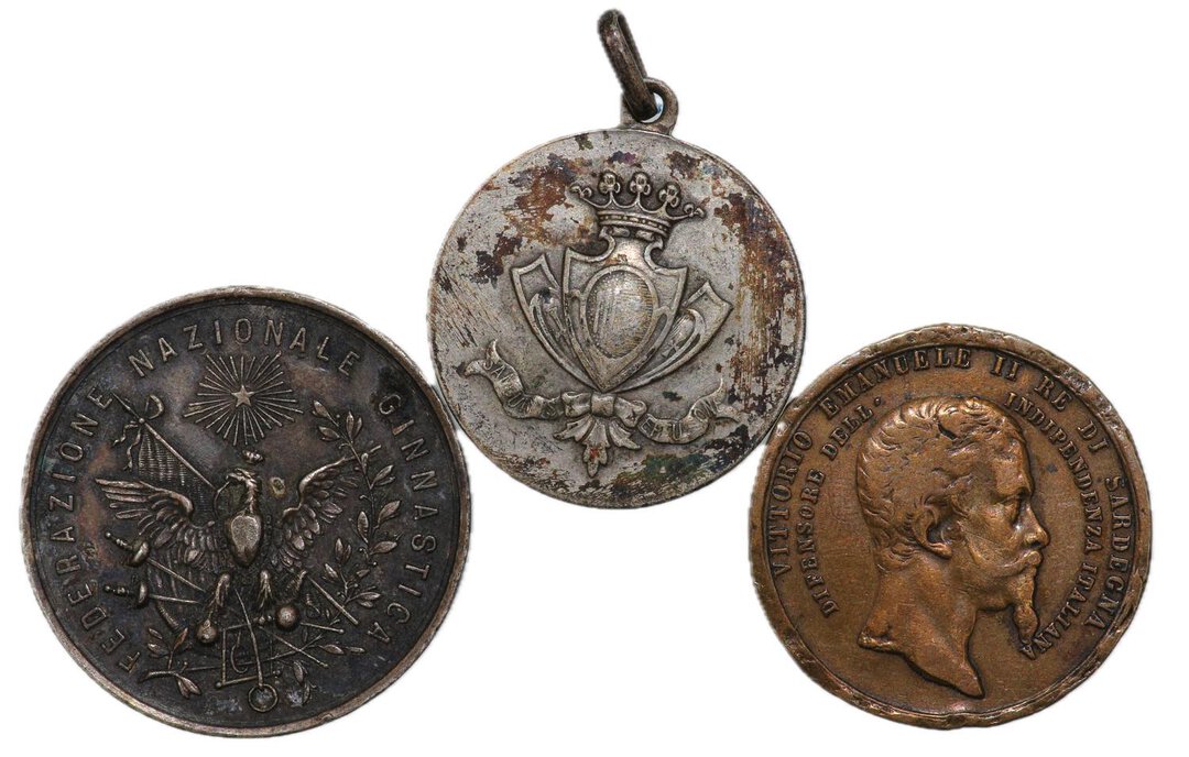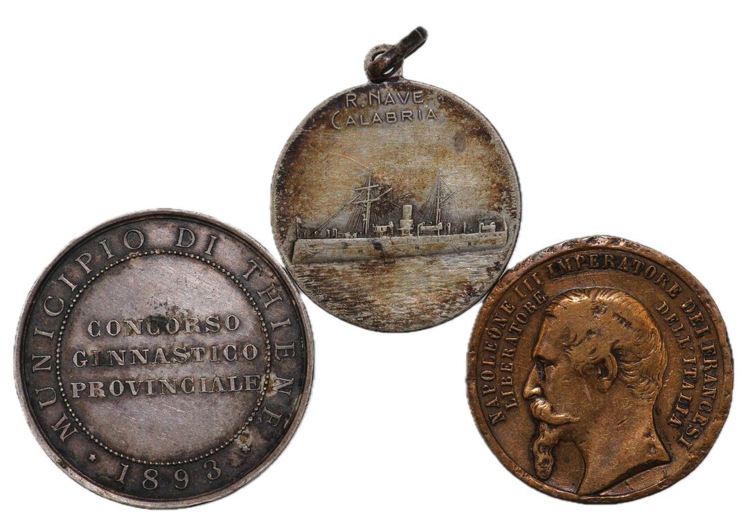 Lotto di 3 medaglie composto da: medaglia Argento Concorso Ginnastico Provinciale; medaglia Argento R. Nave Calabria; medaglia in Bronzo Raffigurante Vittorio Emanuele II e Napoleone III Spedizione solo in Italia. Shipping only to Italy Come da foto