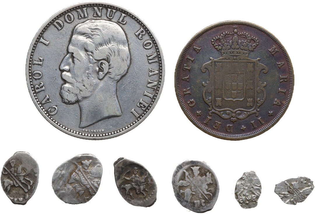 World Coins. Lot of eight (8) coins: Six different Russian AR denga with collector's ticket. Romania, AR 5 leva 1880 and Portugal AE 10 reis 1843.