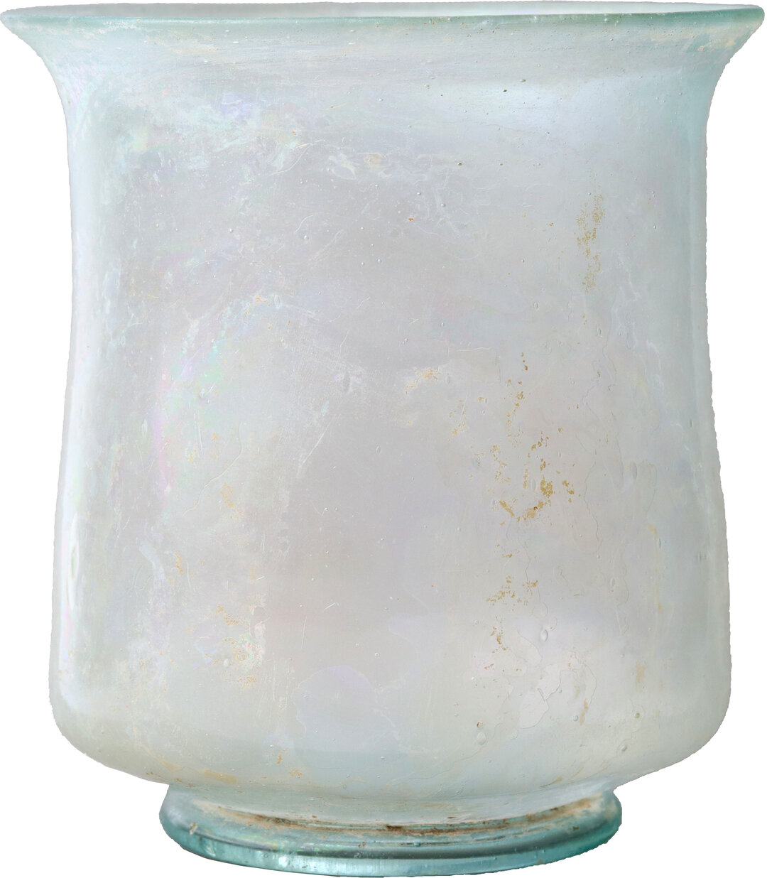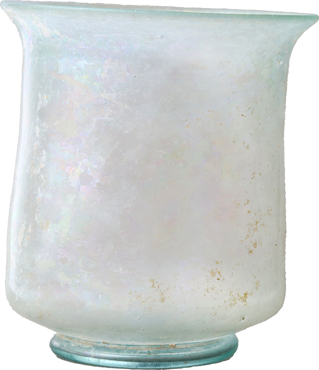 Cylindrical beaker on ring foot and with a slightly everted rim. Slightly bluish-green translucent glass with light iridescence. Delicate piece with thin walls.