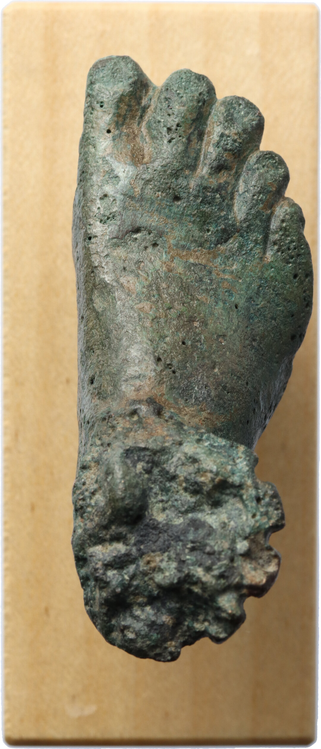 Roman bronze right foot. Fragment of a statuette. Mounted on a small wooden base for display.