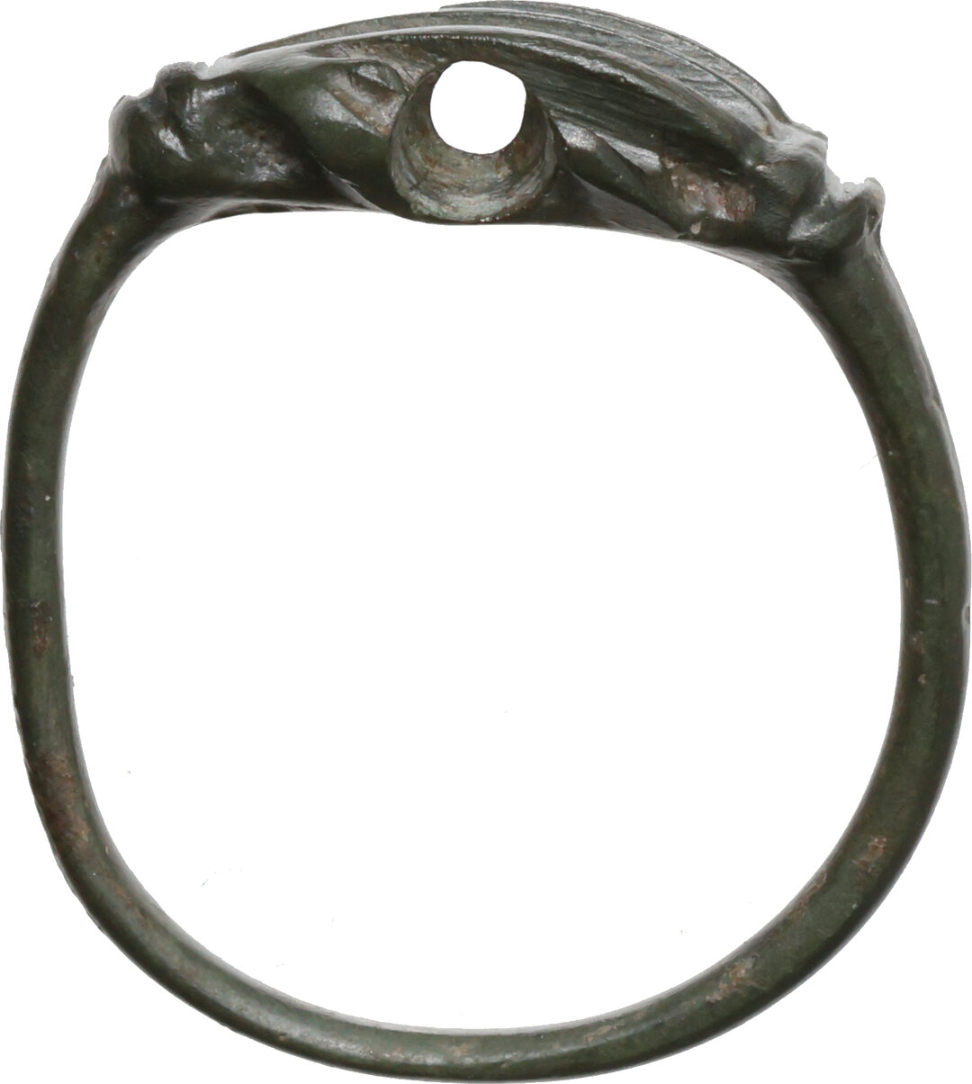 Ancient wedding/engagement bronze ring, with two stylized clasped hands on the bezel. 2.53 g. 22.5 mm. Holed (?). Intact and complete.