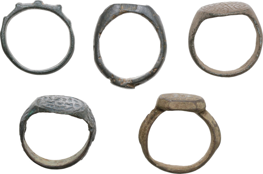 Lot of five ancient bronze rings of various sizes and types, each with different decorative motifs.