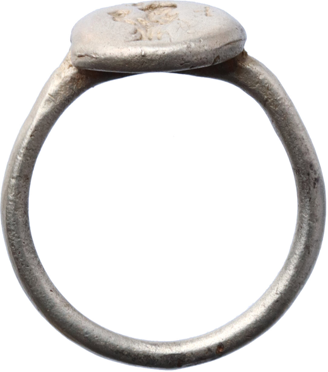 Silver finger-ring with plain hoop and a round bezel engraved with frontal standing Mary Theotokos holding the infant Jesus; to the right, cross.