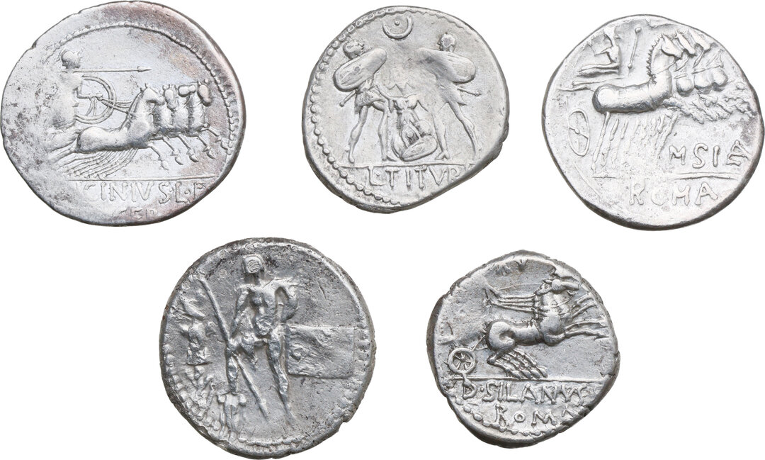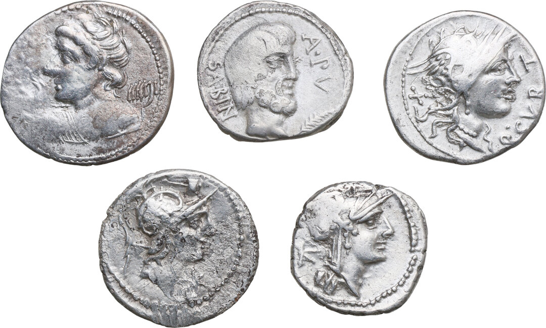 The Roman Republic. Lot of five (5) unclassified AR denarii.