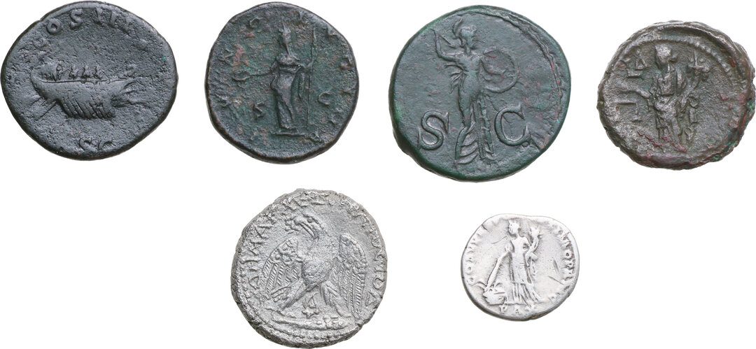 The Roman Empire and Provinces. Lot of six (6) unclassified AE (4) and AR (2) denominations.