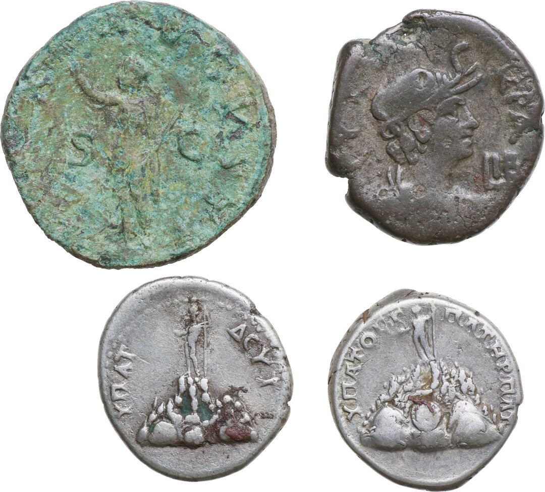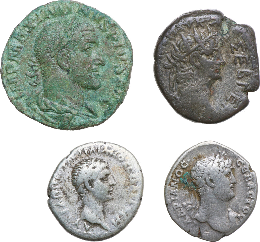 The Roman Empire. Provincial coinage. Lot of four (4) unclassified AR (3) coins from provinces and AE (1) imperial Sestertius.