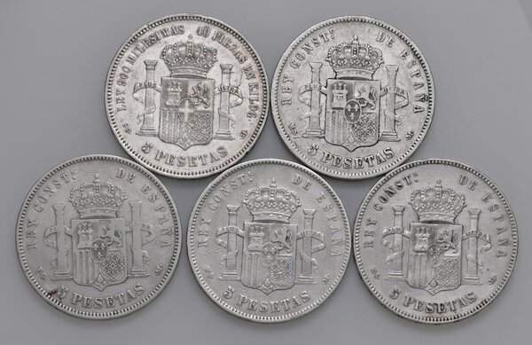 SPAGNA Lotto di cinque monete da 5 Pesetas come da foto, da esaminare. qBB-BB