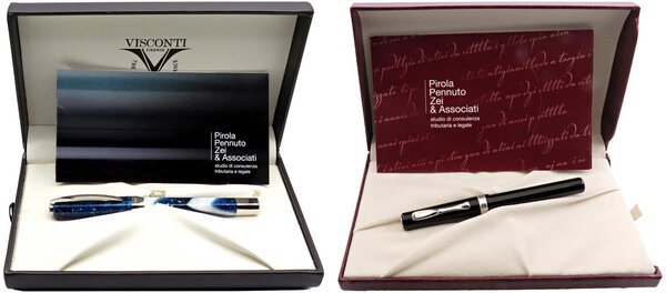 VISCONTI - Lotto di due Penne- Roller. Collezione 2010 “Pirola Pennuto & Zei Associati”. Corpo nero con finiture argentate la prima e corpo in simil madreperla blu e bianca con finiture argentate la seconda. Le penne nuove, mai provate, vendute in rispettive scatole originali, ( la seconda seppur nuova, presenta dei segni di usura alla scatola interna) sono incise all’anello (quella bianca-blu presenta l’incisione all’impugnatura ) con la dicitura “Pirola Pennuto & Zei Associati” che testimonia la produzione annuale limitata e personalizzata della Visconti.. n.d.