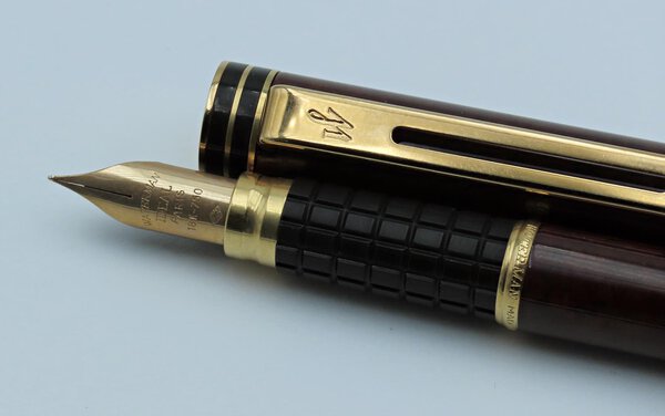 WATERMAN -Penna Stilografica- Corpo e cappuccio in resina bordeaux con finiture dorate. Ricarica a cartuccia. Pennino EF in oro giallo 18kt. Penna nuova, mai inchiostrata né provata venduta in scatola Waterman con segni d'usura. n.d.