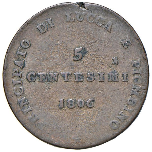 LUCCA Elisa Bonaparte e Felice Baciocchi (1805-1814) 5 Centesimi 1806 - MIR 246 CU (g 10,36) Difetto di tondello al bordo. BB