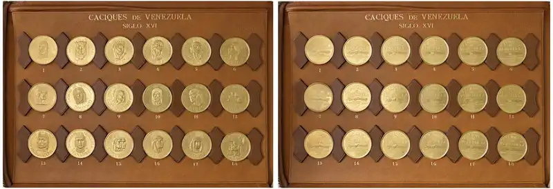 VENEZUELA Caciques Serie completa dedicata ai 18 principali capi indiani che durante il XVI secolo lottarono contro i conquistatori in difesa della loro terra AU (g 22,2 cad.) In meraviglioso cofanetto con certificati di garanzia. FDC